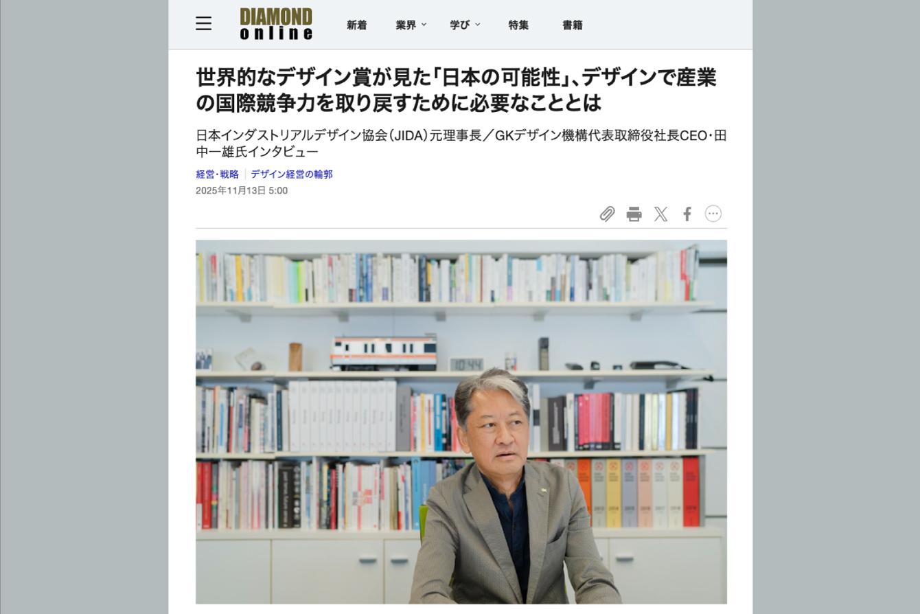 ダイヤモンド・オンラインにて、GKデザイン機構代表取締役社長・田中一雄のインタビューを掲載いただきました。記事では、世界的なデザイン賞「Red Dot Design Award」と、田中がかつて理事長を務めた日本インダストリアルデザイン協会の協力締結を通して、日本のデザインに広がる新たな可能性について語っています。