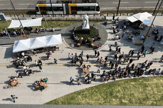 富山駅北口に降り立つと、視線の先に自然の景色と人の動きが連なり、歩き出したくなる風景が広がります。駅から環水公園へ続く全長約420m、幅員約30mの富山市ブールバール広場は、通行の街路空間だけでなく、人々が集い、思い思いに過ごせる場として日常に溶け込んでいます。